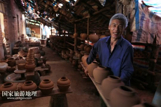 國(guó)家旅游地理 廣西河池8月6日訊 8月4日,顏福友師傅在廣西宜州市郊區(qū)他的制陶作坊里給陶器上釉。在廣西宜州市郊區(qū),65歲的顏福友師傅經(jīng)營(yíng)著他的傳統(tǒng)制陶作坊,作坊里除了顏師傅,還有他的老伴和兩名幫工。顏師傅14歲開(kāi)始當(dāng)學(xué)徒制作陶器,如今掌握著許多手工制陶的獨(dú)門(mén)絕技,在作坊里,幫工只負(fù)責(zé)干體力活,制陶的關(guān)鍵部分都是顏師傅親手完成的。由于顏師傅制作出的陶器質(zhì)量好,許多花卉盆景、釀酒、食品等工廠單位向他訂做陶器產(chǎn)品。但是由于手工制陶辛苦單調(diào),效率低下利潤(rùn)不高,顏師傅的手藝面臨著斷代失傳的危險(xiǎn)。 /新華社發(fā)(覃剛 攝)