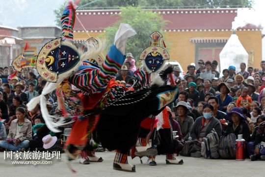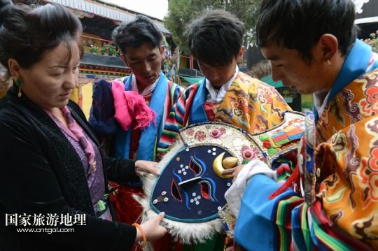 8月6日,在西藏堆龍德慶縣乃瓊鎮(zhèn)甲熱村,覺木隆藏戲團(tuán)的演員們在村里的雪頓節(jié)慶典上表演。