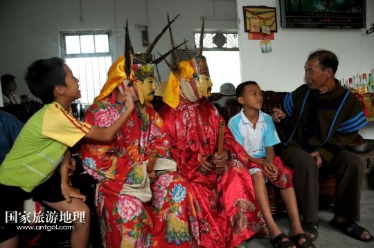 國家旅游地理 廣西河池8月19日訊 8月18日,譚圣慈老人(左一)帶著前來學(xué)習(xí)的兩名男孩跳儺面舞。在廣西北部與貴州交界一帶的我國唯一的毛南族自治縣——環(huán)江毛南族自治縣,神秘的儺戲被譽(yù)為毛南族的“族寶”。原始古樸、風(fēng)格獨(dú)特的儺戲是毛南族的民間傳統(tǒng)舞蹈,藝人在表演過程中經(jīng)常戴著被稱為儺面的木制面具。儺面一般高30厘米、寬20厘米,由毛南族藝人在民族口頭文學(xué)的基礎(chǔ)上依據(jù)個(gè)人想象創(chuàng)作,用優(yōu)質(zhì)木塊雕琢而成,共有文、武、善、兇四大類72種面相。