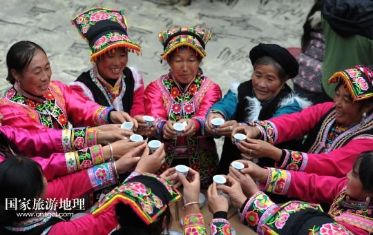 國家旅游地理 四川阿壩11月2日訊 11月2日,身著節(jié)日盛裝的四川省阿壩州汶川縣龍溪鄉(xiāng)村民們舉杯迎接羌?xì)v新年的到來。當(dāng)日,四川省阿壩州汶川縣龍溪鄉(xiāng)舉行傳統(tǒng)儀式迎接即將到來的羌?xì)v新年。今年的11月3日農(nóng)歷十月初一是羌?xì)v新年,這是羌族一年中最為隆重的“慶豐收、送祝福、祈平安”的節(jié)日,按民間習(xí)俗,過羌年時要還愿敬神,全寨人歡聚一堂,吃團(tuán)圓飯,共慶佳節(jié)。 /新華社發(fā)(何海洋 攝)