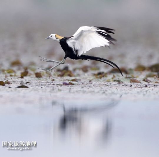 5月29日,在江西省九江市賽城湖濕地,一只水雉準備在水面上降落。