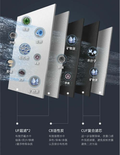 除去主濾芯,另外兩個副濾芯分別是CB活性炭濾芯和CUF活性炭超濾膜復(fù)合濾芯。其中,CB活性炭濾芯吸附水中余氯、異色異味、有機物,改善飲水口感,讓自來水變得更加甘甜鮮活,口感甚佳;而CUF活性炭超濾膜復(fù)合濾芯則能進(jìn)一步吸附水中的余氯等異色異味,提升飲水口感,并防止碳粉泄露和微生物侵入,避免水質(zhì)二次污染。